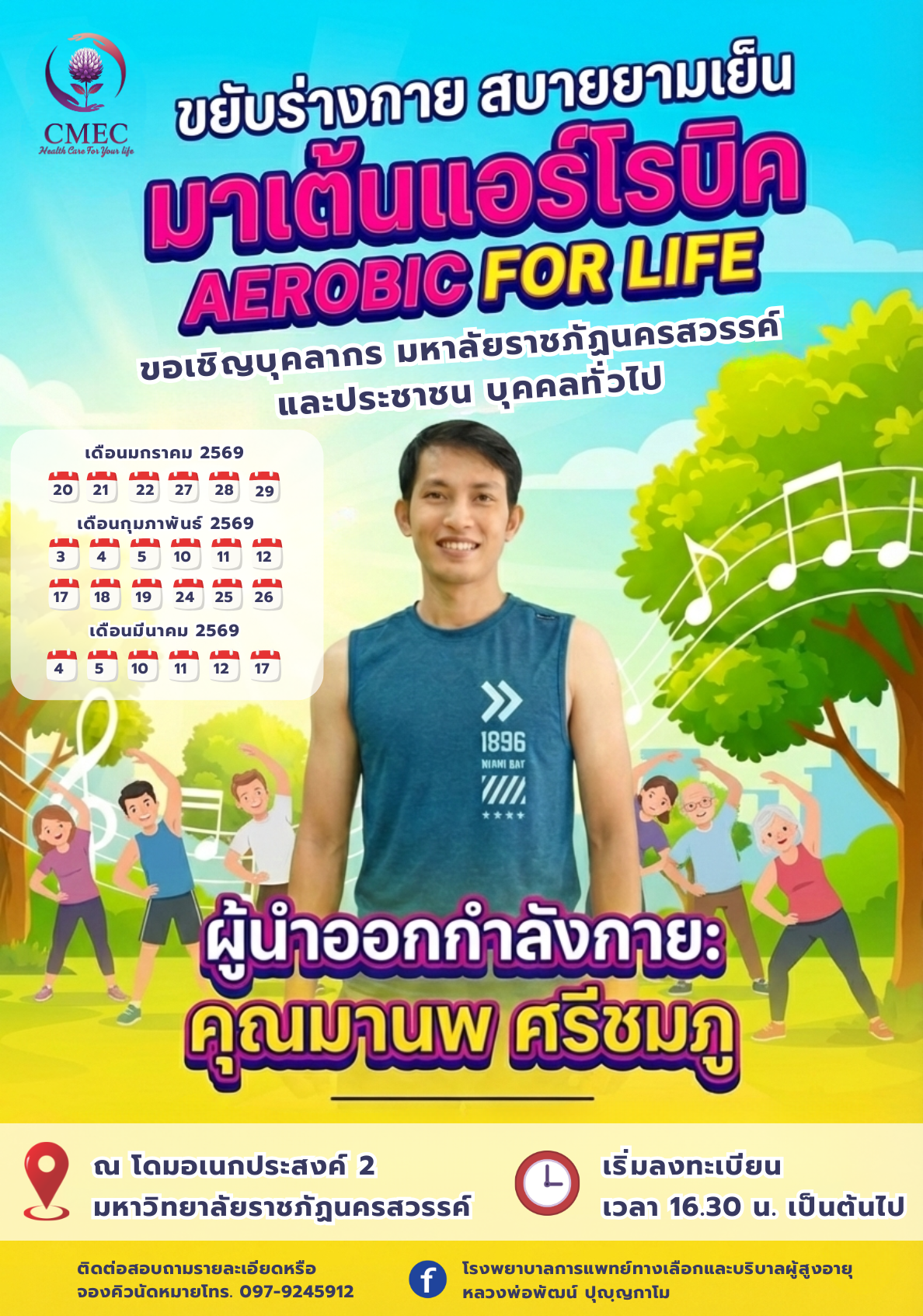 สุขภาพดีสร้างได้! ขอเชิญพี่น้องชาวมหาวิทยาลัยราชภัฏนครสวรรค์ และประชาชนทั่วไป มาร่วมออกกำลังกายในกิจกรรม "Aerobic for Life" เสริมสร้างภูมิคุ้มกันให้ร่างกายแข็งแรงไปกับ "คุณมานพ ศรีชมภู" ผู้นำเต้นที่จะพาเราสนุกไปด้วยกัน!